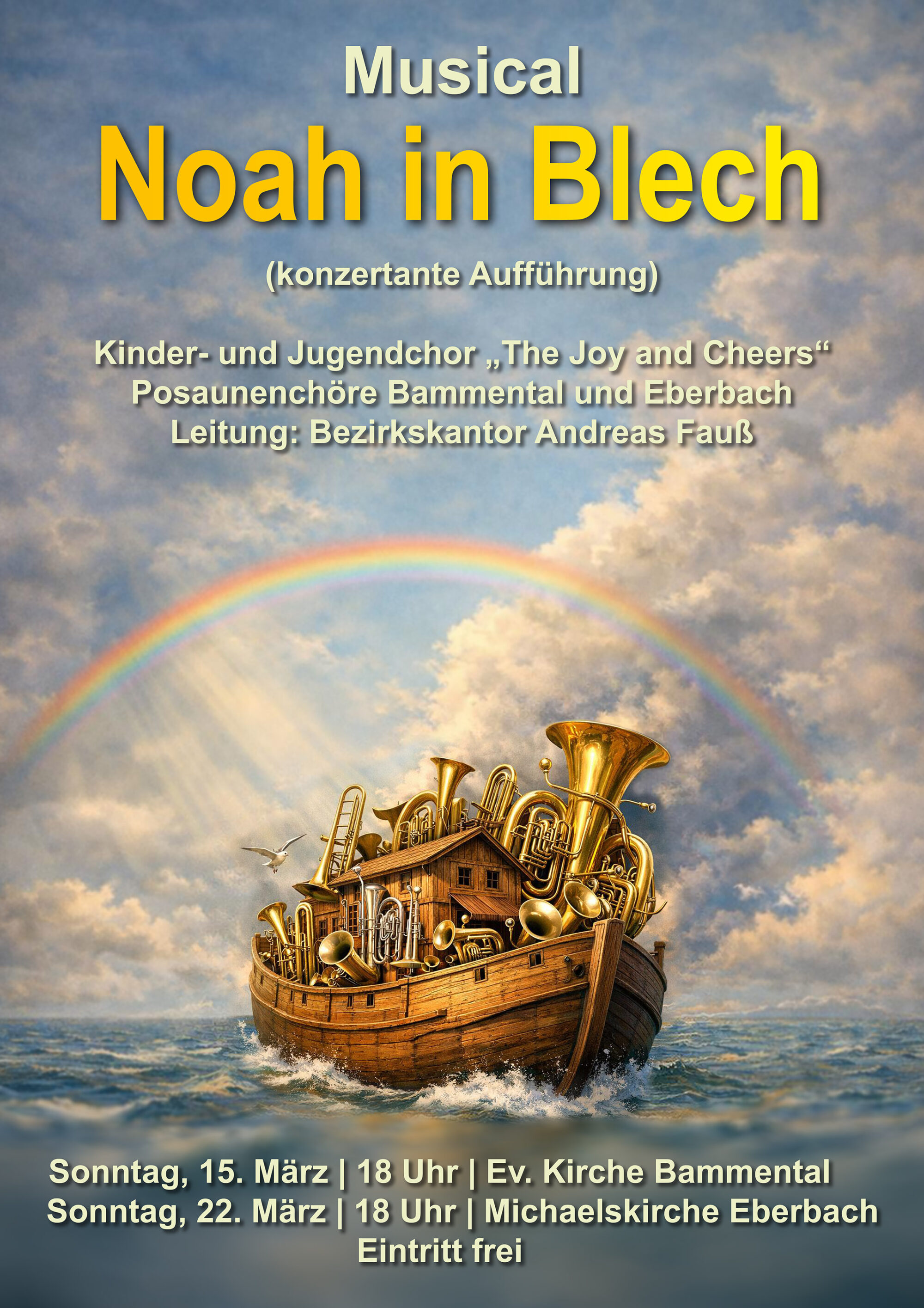 Unter der Leitung von Bezirkskantor Andreas Fauß, wird am Sonntag dem 15. März um 18:00 Uhr in der evangelischen Kirche das Musical „Noah in Blech“ aufgeführt.